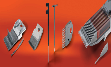 - Herstellung von Lochnadeln, Musterfadenführern, Raschelnadeln und Platinen mit engsten Toleranzen in Bezug auf Verrundung, Maßhaltigkeit, Wiederholgenauigkeit und Dicke